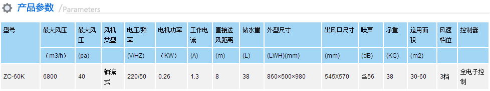 ZC-60K窗口型降温科叶环保空调产品参数: