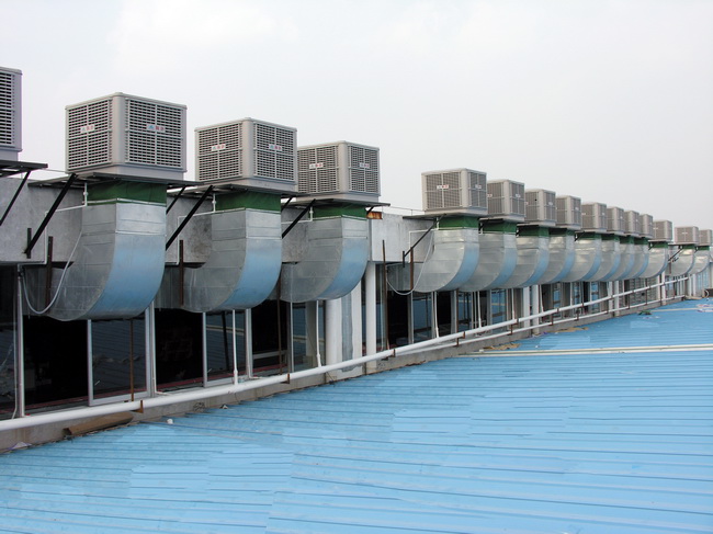 志高空调生产车间正在使用科叶环保空调(蒸发式固定冷风机18000风量)降温